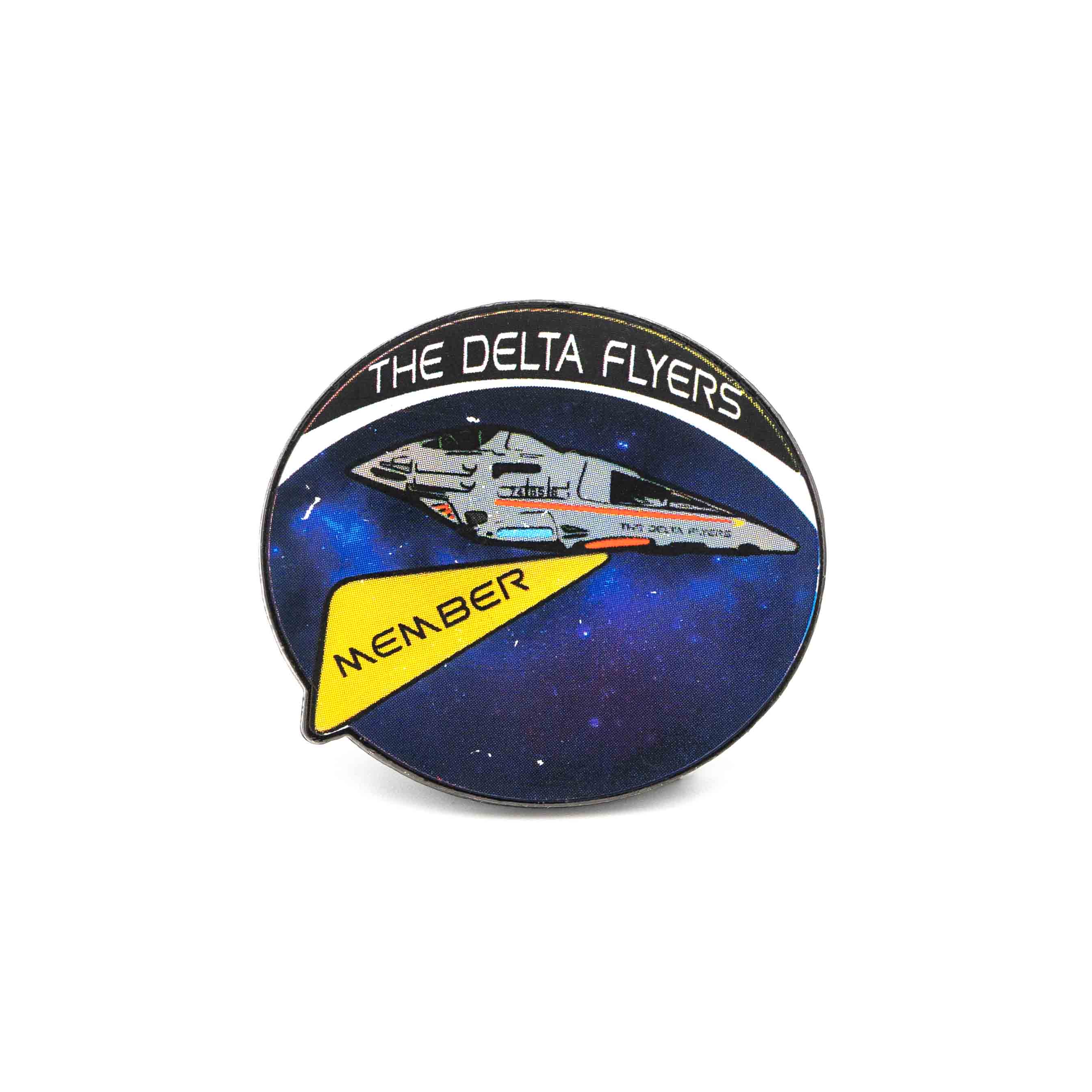 - Custom cosmic battleship lapel pin featuring vibrant UV printing, black nickel plating, and "THE DELTA FLYERS" inscription, symbolizing adventure and camaraderie.