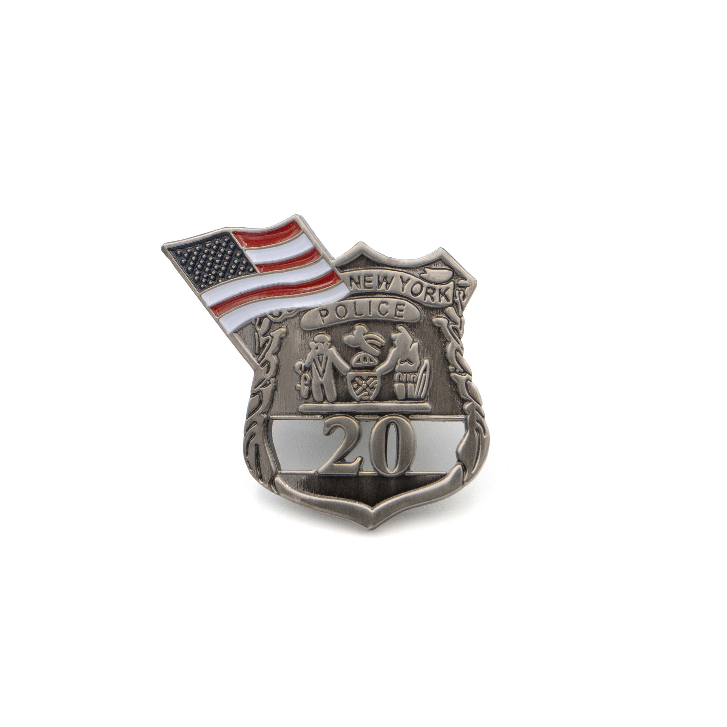 - Shield-shaped NYPD lapel pin with American flag colors and 3D die-casting zinc alloy mold, soft enamel coloring, and antique nickel plating.